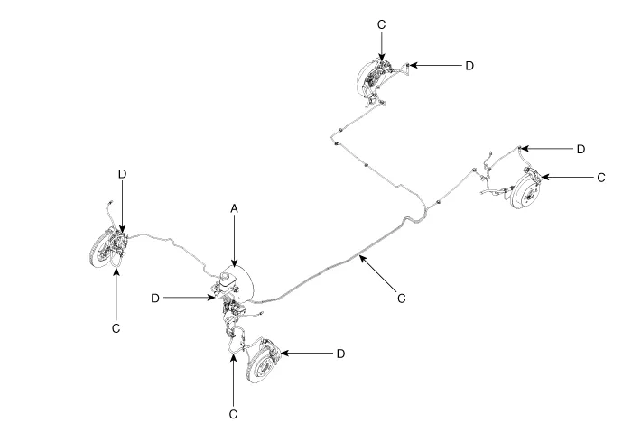 | Brake hoses (C) | Look for damage or signs of fluid leakage. Replace the brake hose with a new one if it is damaged or leaking. | |
