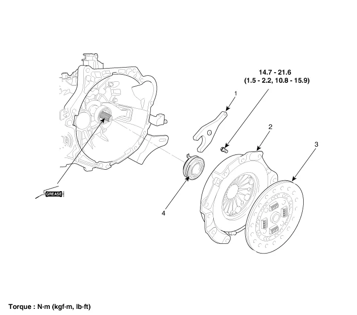 | 1. Clutch release fork 2. Clutch cover assembly | 3. Clutch disk assembly 4. Clutch release bearing |