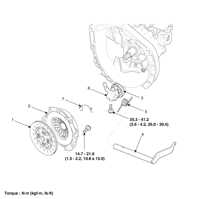 | 1. Clutch disc assembly 2. Clutch cover assembly 3. Clutch release bearing 4. Clutch release lever assembly | 5. Return spring 6. Clutch release fork 7. Return clip |