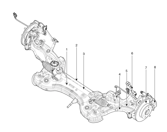 | 1. Sub frame 2. Stabilizer bar 3. Gear box 4. Tie rod end | 5. Front lower 6. Stabilizer link 7. Brake disc 8. Brake caliper |