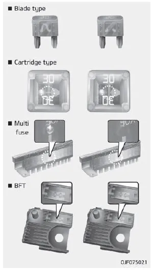 Three kinds of fuses are used: blade type for lower amperage rating, cartridge type, and multi fuse for higher amperage ratings.
