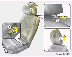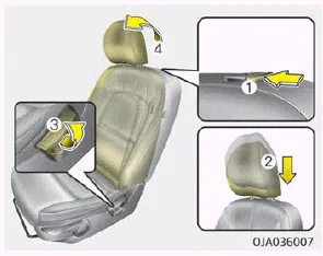 3. Press the headrest release button (3) while pulling the headrest up (4).