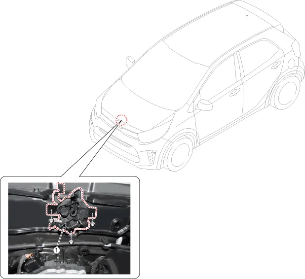 Components and components location Component Location 1. Hood latch release handle Repair procedures Replacement 1. Using a remover, remove the hood release handle (A).