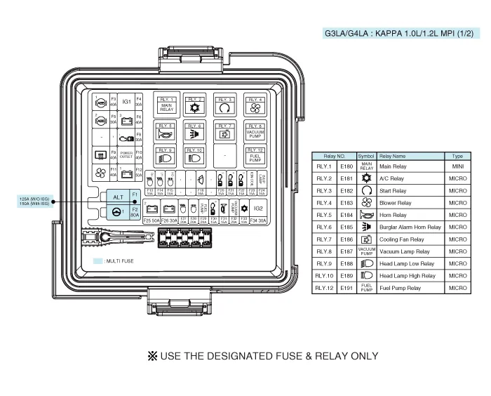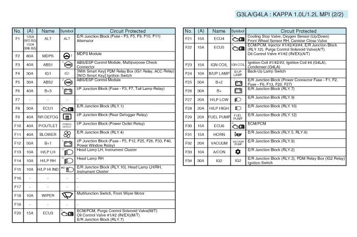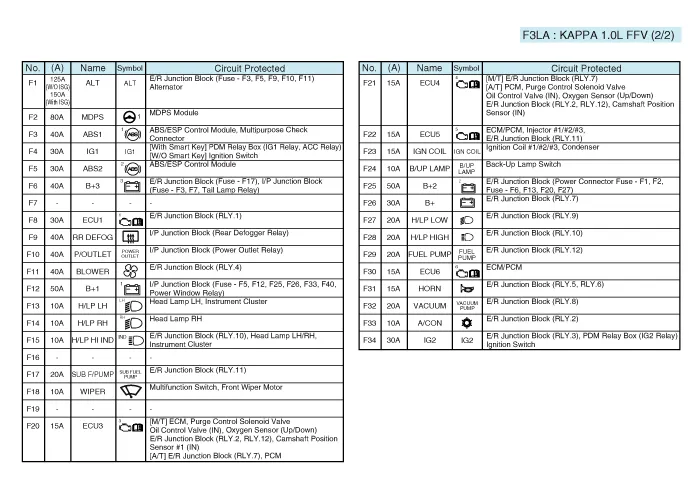 Components and components location Component Location I/P Junction Box Circuit (I/P Junction Box) Description and operation Description Communication Network Diagram Abbreviation Explanation ABS Anti-lock Brake System ACU Airbag Control Unit AEB Autonomous Emergency Braking B-CAN Body Controller Area Network BCM Body Control Module C-CAN Chassis Controller Area Network CLU Cluster Module DATC Dual Automatic Temp Control EMS Engine Management System ESC Electronic Control Suspention EVP Eva Vacuum Pump I-BOX Telematics System LPI Liquid Petroleum Injection H_U Head Unit (Audio / AVN) M-CAN Multi media Controller Area Network MDPS Motor Driven Power Steering PGS Parking Guide System SLM Seat belt remind & Lighting Module SMK Smart Key Unit TCU Transmission Control Unit TMU Telematics System TPMS Tire Pressure Monitoring System Repair procedures Fuse Inspection 1.