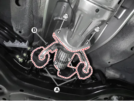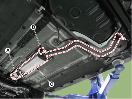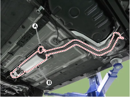 | 1. | Detach the rubber hanger (A) from the catalytic converter & center muffler assembly. |