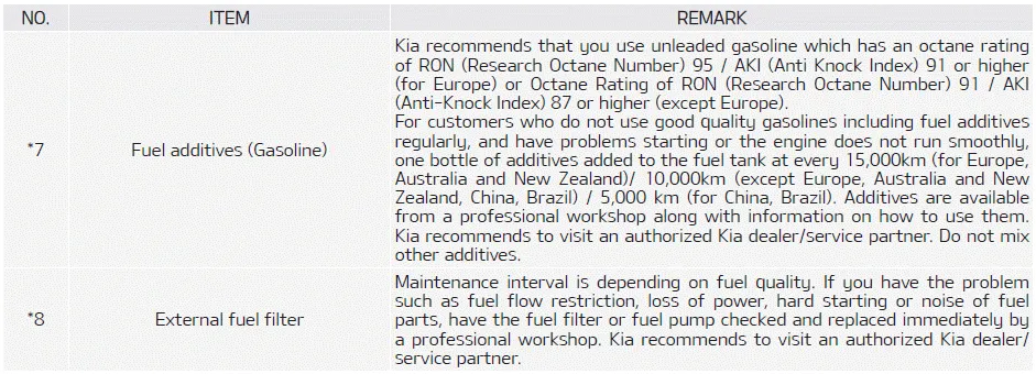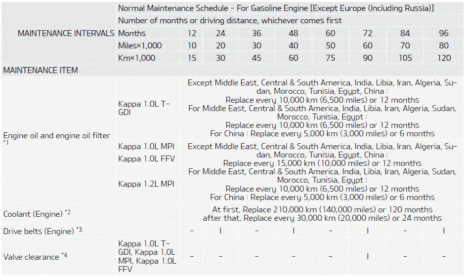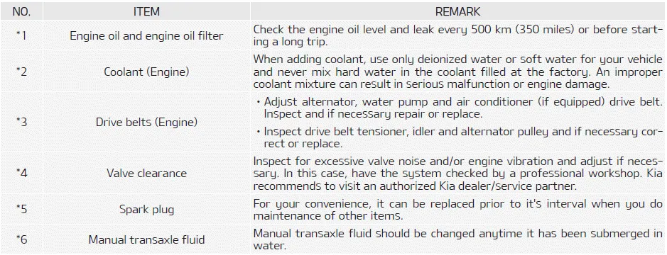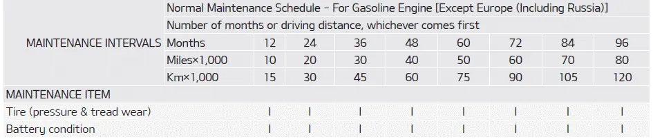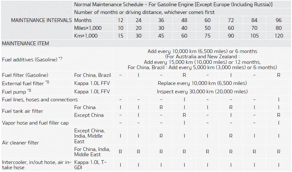 Maintenance operation I : Inspect and if necessary, adjust, correct, clean or replace. R : Replace or change. SEVERE DRIVING CONDITIONS A: Repeatedly driving short distance of less than 8 km (5 miles) in normal temperature or less than 16 km (10 miles) in freezing temperature.