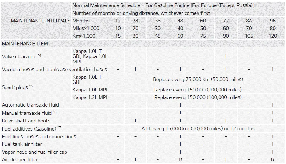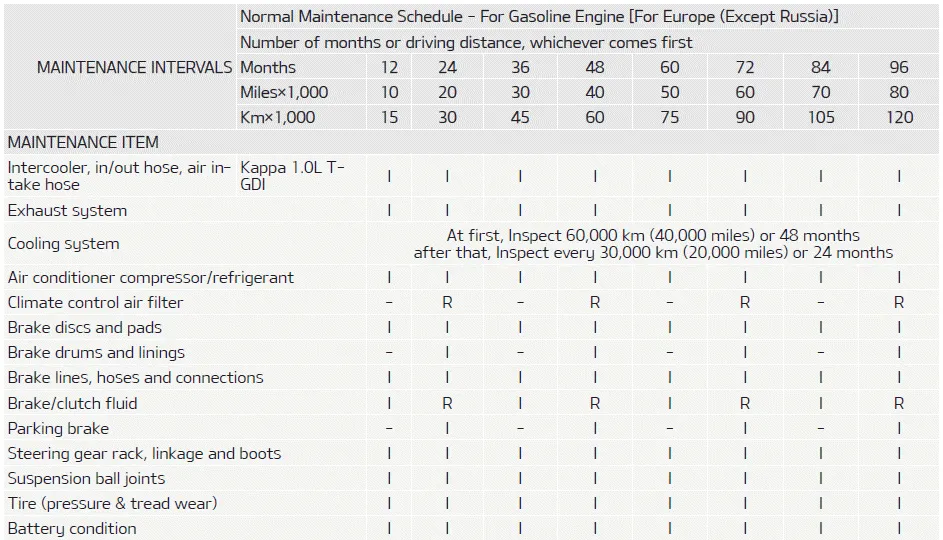 Maintenance operation I : Inspect and if necessary, adjust, correct, clean or replace. R : Replace or change. SEVERE DRIVING CONDITIONS A: Repeatedly driving short distance of less than 8 km (5 miles) in normal temperature or less than 16 km (10 miles) in freezing temperature.