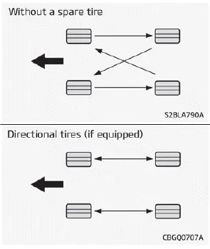 When rotating tires, check for uneven wear and damage. Abnormal wear is usually caused by incorrect tire pressure, improper wheel alignment, outof- balance wheels, severe braking or severe cornering. Look for bumps or bulges in the tread or side of tire. Replace the tire if you find either of these conditions. Replace the tire if fabric or cord is visible. After rotation, be sure to bring the front and rear tire pressures to specification and check lug nut tightness.