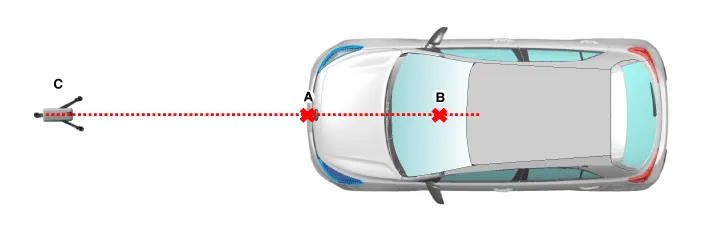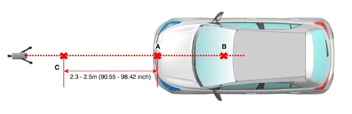 Mark (C) at 2.3 - 2.5m (90.55 - 98.42 inch) from (A) in front of the vehicle.