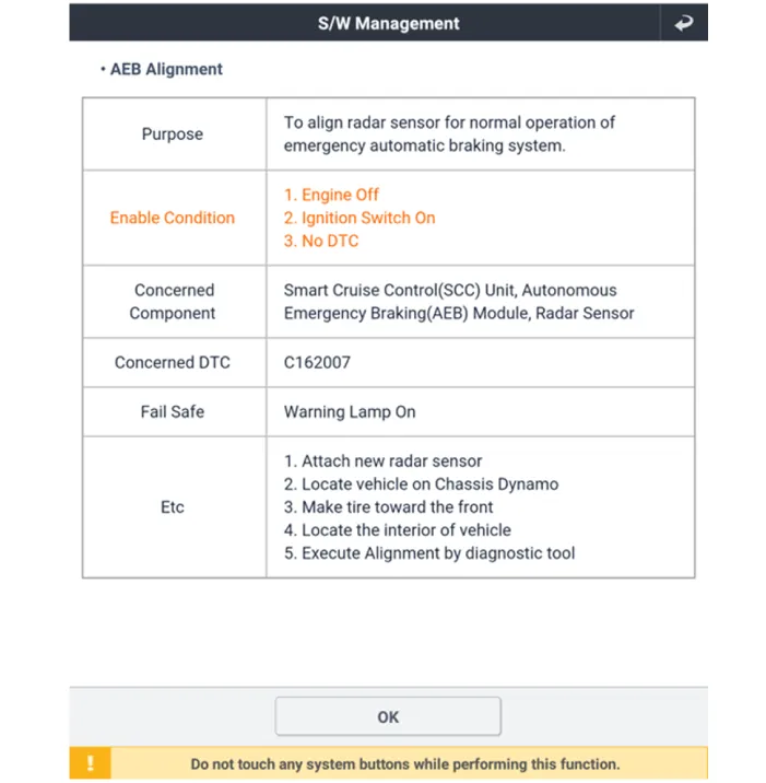 In order for the radar sensor to operate correctly, it must be properly aligned parallel to the driving direction of the vehicle.For this reason, the radar sensor alignment procedure must be carried out whenever the sensor has been reinstalled or replaced with a new one.