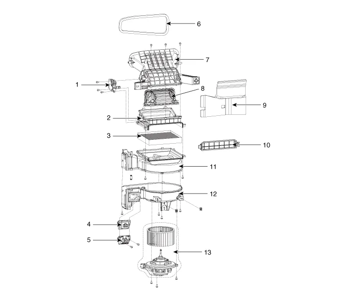 | 1. Intake Actuator 2. Intake Case [Lower] 3. Air Filter 4. FET 5. Resister 6. Intake Seal 7. Intake Case [Upper] | 8. Intake Door Assembly 9. Anti Noise Pad 10. Air Filter Cover 11. Blower Case [Upper] 12. Blower Case [Lower] 13. Blower Motor Assembly |
