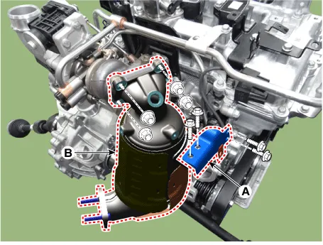 | 11. | Remove the warm-up catalytic converter (WCC) upper stay (A) and then remove the warm-up catalytic converter (WCC) (B).