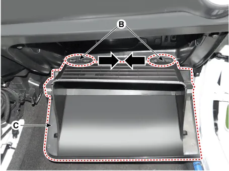 | 2. | Disconnect the pins (B) and then remove the glove box (C).