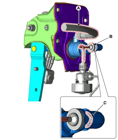 | 7. | Disconnect the reservoir hose (A) and clutch tube (B) from the clutch master cylinder after removeing the pin (C).