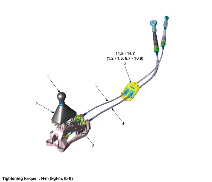 | 1. Knob 2. Boots 3. Shift lever assembly | 4. Shift cable 5. Select cable 6. Retainer |