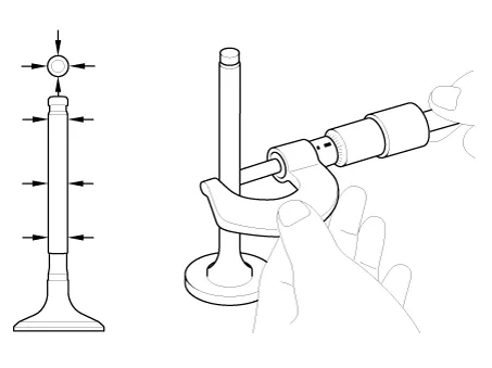 | 1. | Inspect valve stems and valve guides.
