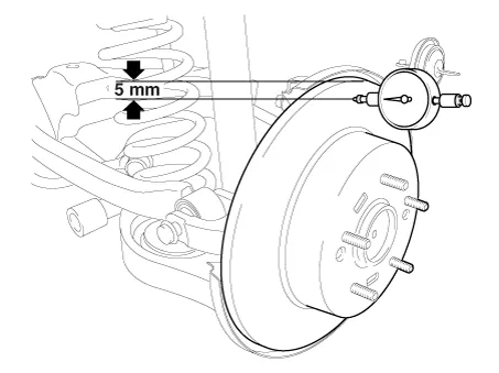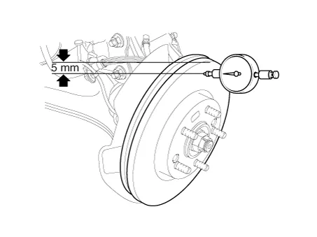 | 1. | Place a dial gauge about 5mm (0.2 in.) from the outer circumference of the brake disc, and measure the runout of the disc.