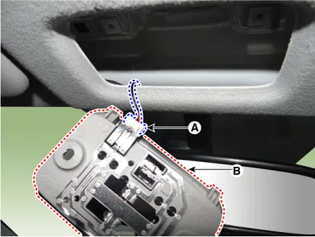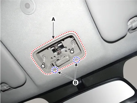 | 4. | Remove the map lamp assembly (B) after disconnecting the map lamp connector (A).