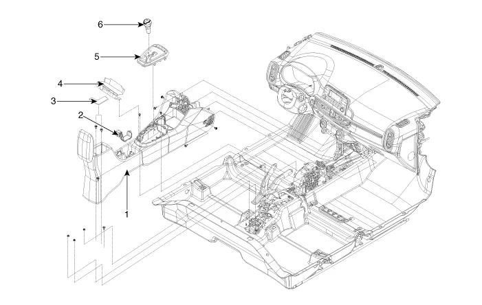 | 1. Floor console assembly 2. Parking brake cover 3. Rear console tray mat | 4. Floor console front bezel assembly 5. Console indicator cover [M/T] 6. Gear knob |