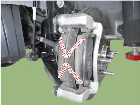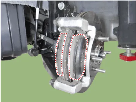 | 1. | Check the pad wear. Measure the pad thickness and replace it, if it is less than the specified value.