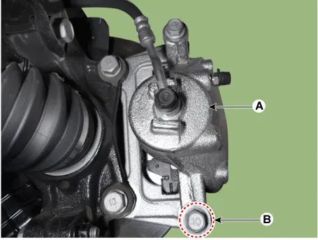 | 2. | Loosen the guide rod bolt (B) and then pivot the caliper body (A) up out of the way.