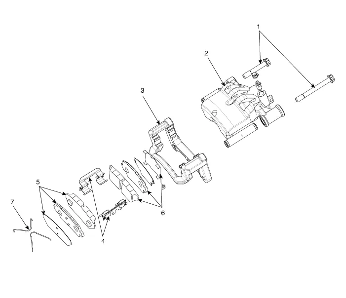 | 1. Guid bolt 2. Caliper body 3. Caliper member 4. Pad liner | 5. Brake pad assembly [OUT] 6. Brake pad assembly [IN] 7. Return spring |