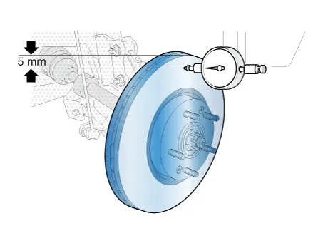 | 1. | Place a dial gauge about 5mm (0.2 in.) from the outer circumference of the brake disc, and measure the runout of the disc.