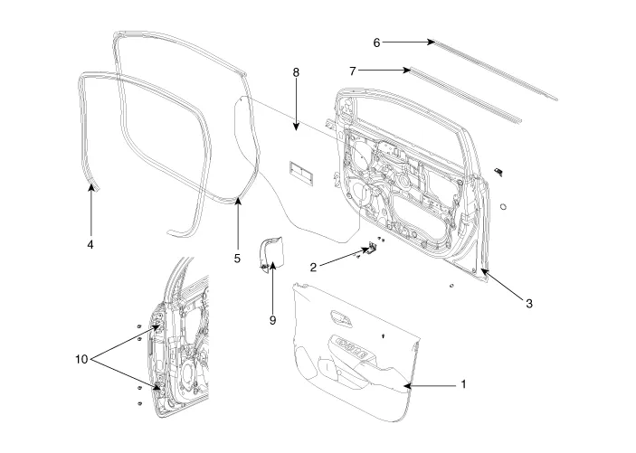 | 1. Front door trim assembly 2. Front door trim mounting bracket 3. Front door panel assembly 4. Front door body side weatherstrip 5. Front door side weatherstrip | 6. Front door belt outside weatherstrip 7. Front door belt inside weatherstrip 8. Front door trim seal 9. Front door quadrant inner cover 10. Front door hinge |