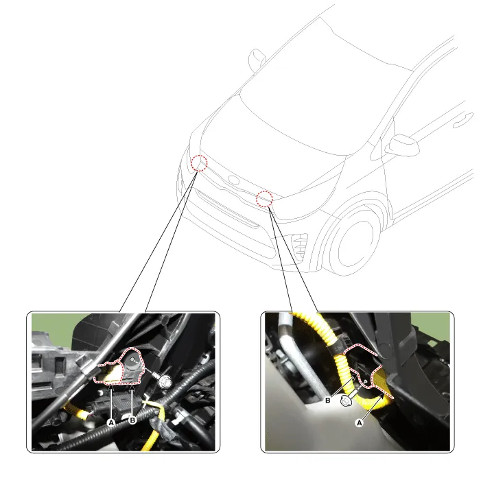 | 5. | Remove the front impact sensor (B) after loosening the mounting bolt.