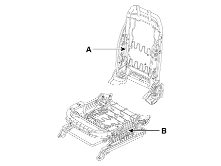 | 3. | After loosening the mounting bolts, disconnect the front seat back frame assembly (A) and front seat cushion frame assembly (B).