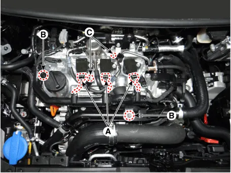 | 6. | Remove the low pressure fuel line mounting bolts (C).
