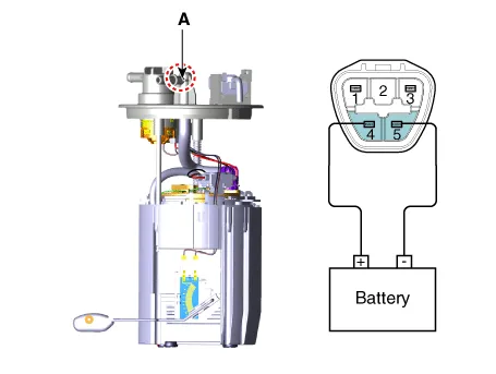 Check motor operation by fuel pump connector (A) connecting power(No.2) and ground(No.4)