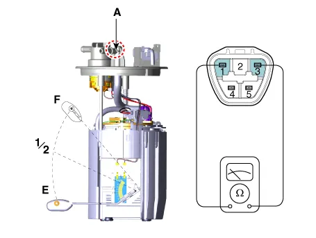 Using an ohmmeter, measure the resistance between terminals 1 and 3 of sender connector (A) at each float level.