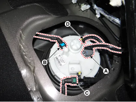 Repair procedures Removal 1.Remove the fuel pump. (Refer to Fuel Delivery System - "Fuel Pump") 2.Disconnect the fuel pump motor connector (A) and fuel sender connector (B).