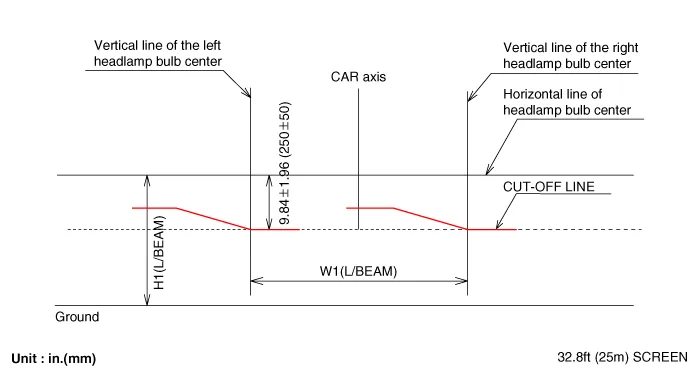 | 2. | Turn the front fog lamp on without the driver aboard. The cut-off line should be projected in the allowable range (shaded region)