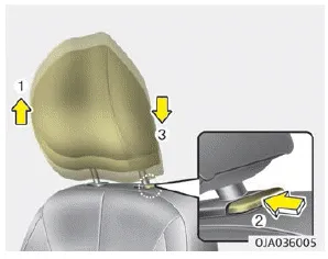 To raise the headrest, pull it up to the desired position (1). To lower the headrest, push and hold the release button (2) on the headrest support and lower the headrest to the desired position (3).