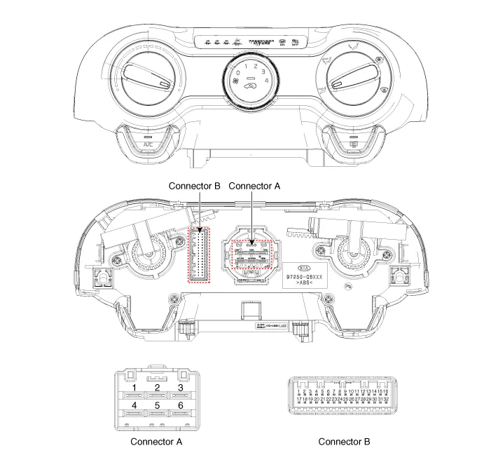 Heater & A/C Control Unit(Full Automatic)Components and components location Components Control Panel Connector pin function No. Connector A Connector B 1 Battery PAB IGN1 2 ISG Battery (+) PAB On signal 3 Illumination (+) PAB Off signal 4 Sensor REF (+5V) - 5 Mode control actuator Feedback - 6 Temperature control actuator Feedback - 7 Intake actuator Feedback - 8 Evaporator sensor (+) - 9 Ambient sensor (+) - 10 Driver mode control actuator (Vent) - 11 Driver mode control actuator (DEF) Seat belt reminder 12 Temperature control actuator (Cool) Rear left seat belt reminder 13 Temperature control actuator (Warm) Rear center seat belt reminder 14 Intake actuator (FRE) Rear right seat belt reminder 15 Intake actuator (REC) - 16 HTD Ground 17 Rear defog switch 18 - 19 - 20 Illumination (-) 21 IGN2 22 IGN1 23 Blower motor (+) 24 Photo sensor (-) 25 - 26 - 27 - 28 - 29 - 30 - 31 Detent out (-) 32 - 33 C_CAN (High) 34 C_CAN (Low) 35 FET (Drain Feedback) 36 FET (Gate) 37 ECV (+) 38 ECV (-) Repair procedures Self Diagnosis 1...
