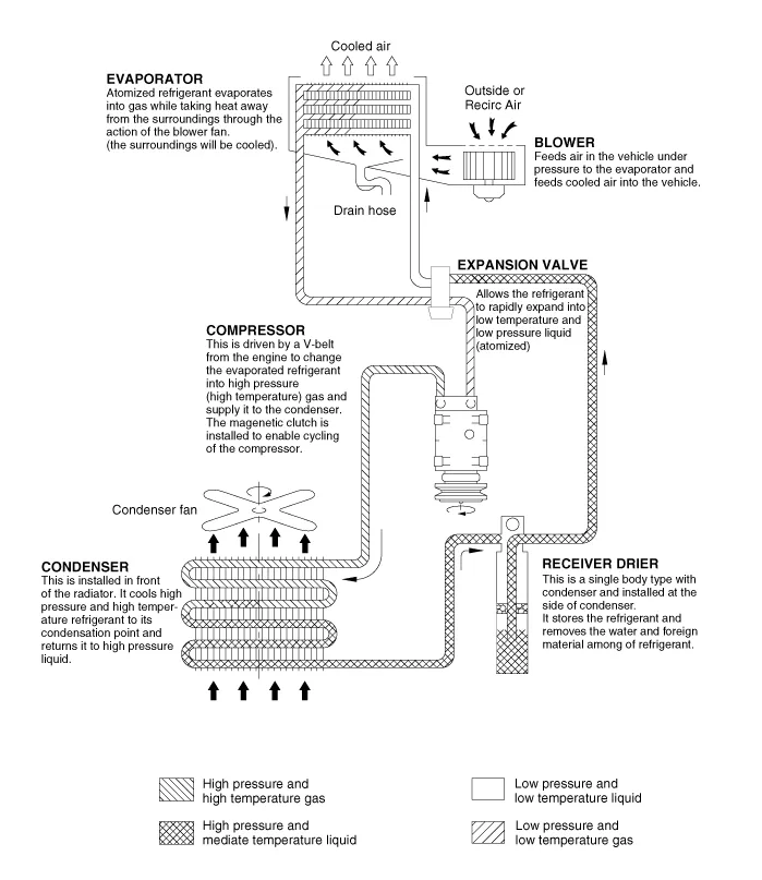 A/C pressure transducer convert the pressure value of high pressure line into voltage value after measure it. By converted voltage value, engine ECU controls cooling fan by operating it high speed or low speed. Engine ECU stop the operation of compressor when the temperature of refrigerant line is so high or so low irregularly to optimize air conditioning system.