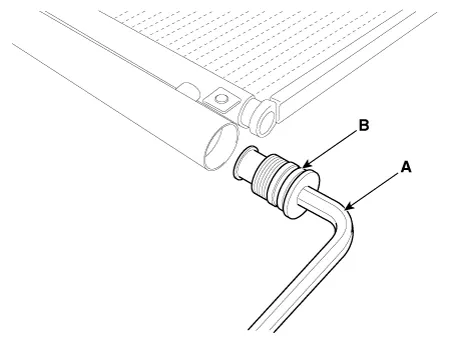 Remove the desiccant (A) from condenser using a long nose plier. Check for crumbled desiccant and clogged bottom cap filter.