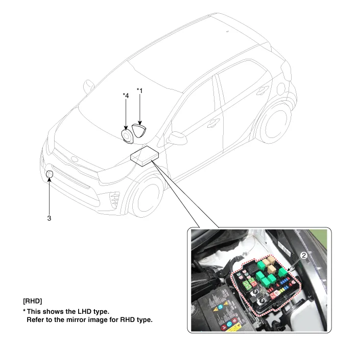 | 1. Horn switch 2. Horn relay | 3. Horn 4. Clock spring |