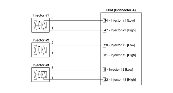 | 3. | Measure resistance between the injector terminals 1 and 2. |