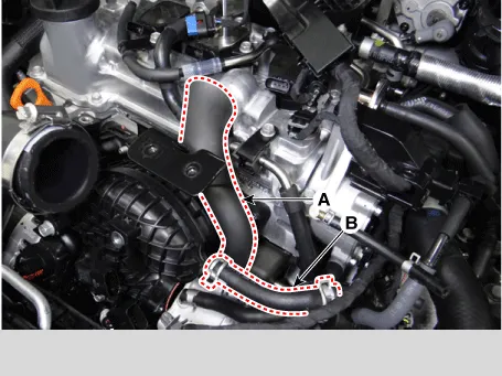 | 5. | Disconnect the positive crankcase ventilation (PCV) hose (A) and vacuum hose (B).
