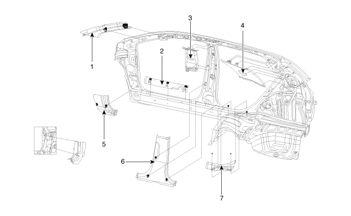 | 1. Front pillar trim assembly 2. Front door scuff trim assembly 3. Center pillar upper trim assembly 4. Rear pillar trim assembly | 5. Cowl side trim assembly 6. Center pillar lower trim assembly 7. Rear door scuff trim assembly |