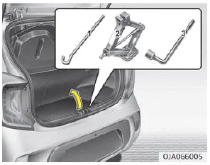 The jack, jack handle, wheel lug nut wrench are stored in the luggage compartment. Pull up the luggage box cover to reach this equipment.
