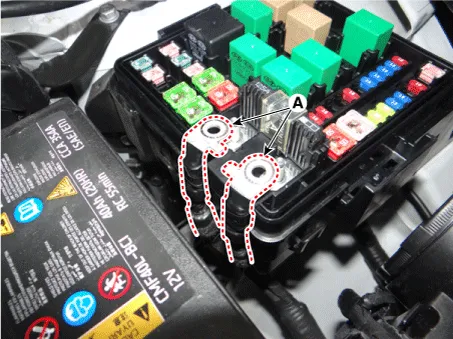 | 2. | Remove the power cable terminals (A) after loosening the nuts from the engine room fuse & relay box.