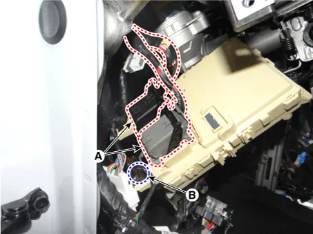 | 4. | Remove the interior junction block wiring mounting clip (B).