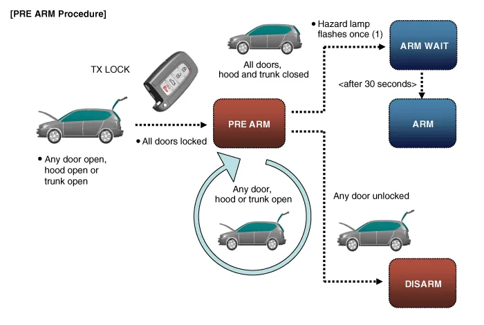 then the vehicle automatically enters "ARM" mode via "ARM WAIT" mode. 2-1. If LOCK button is pressed while at least one of all doors, hood and tailgate is open, "PRE ARM" mode turns on. 2-2.