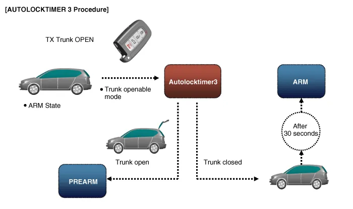 | 2) | B/A state changes "AUTOLOCKTIMER3" to "ARMWAIT", when the "30sec." timer expires with all doors lock and closed. |