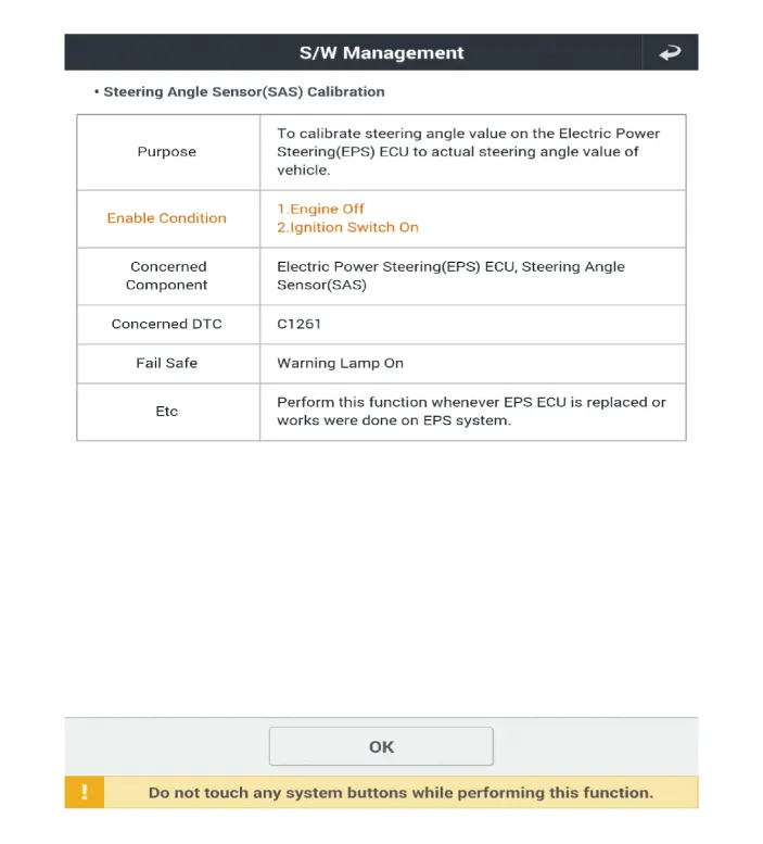 | 3. | Select the "Steering Angle Sensor (SAS) Calibration" on KDS screen, then select OK. |