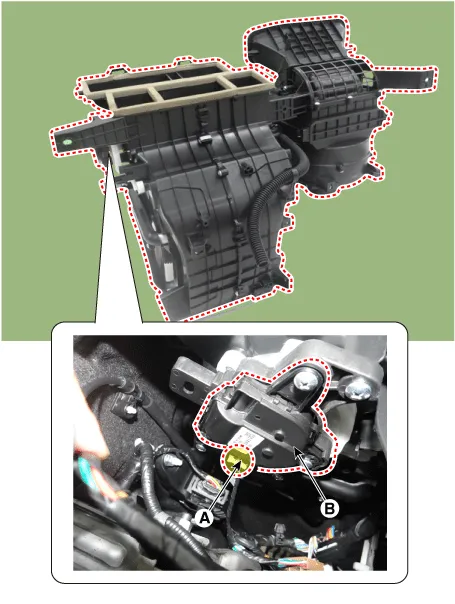 | 3. | Disconnect the connector (A) and then remove the mode control actuator (B) after loosening the mounting screws